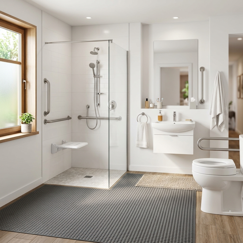 Bathroom safety means arranging the room and adding simple tools to prevent slipping on wet floors and tripping over rugs. It is about creating a stable environment where you can shower, bathe, and use the toilet without the fear of falling down.